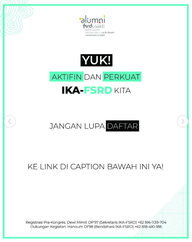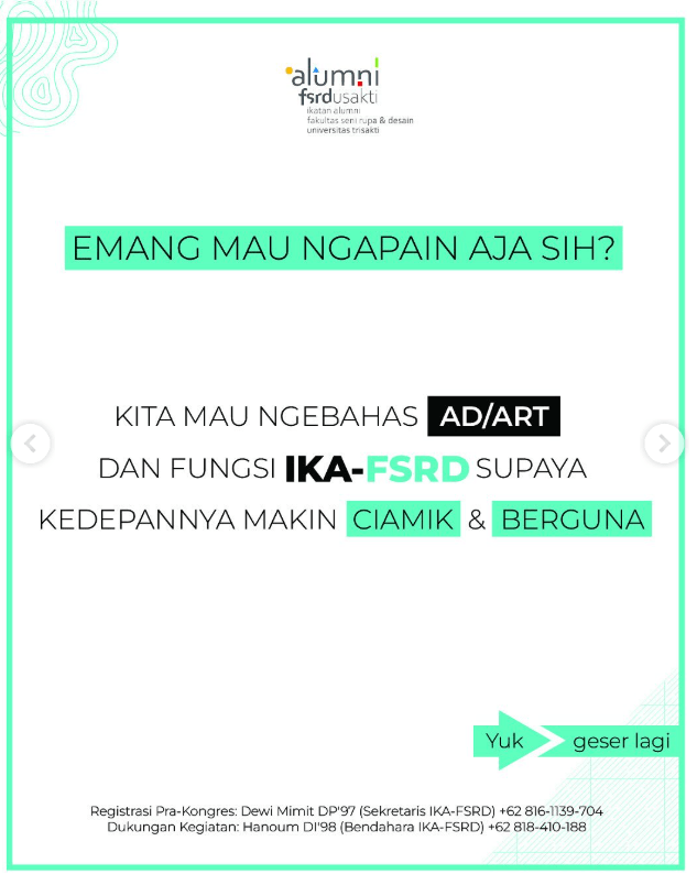 Yuk kita bikin IKA-FSRD kita lebih *Aktif* dan *Setrong* lagi dengan mendaftar ke Pra-Kongres yang tujuan nya akan membahas AD/ART untuk IKA-FSRD kita.